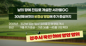 45홀 규모의 초대형 대중제 골프장을 운영하고 있는 서라벌GC가 30년째 남의 땅에 진입로를 개설하고 버젓이 ‘미준공 비정상 영업’을 해오고 있지만 아무런 조치가 취해지지 않고 있다.서라벌GC는 ‘조건부’ 또는 ‘임시’ 꼬리표를 단 채 2005년 영업을 개시했고, 20년이 흐른 현재까지 그 상태를 이어오다 최근에는 9홀을 추가로 증설해 기존 36홀에서 45홀로 사업 규모를 더욱 확대하고 있다.이에 업계는 서라벌GC가 경주시의 묵인 하에 영업을 영위하고 있는 한 미준공 도로 등의 시설 준공을 위해 굳이 비용을 들일 필요가 없을 것이라