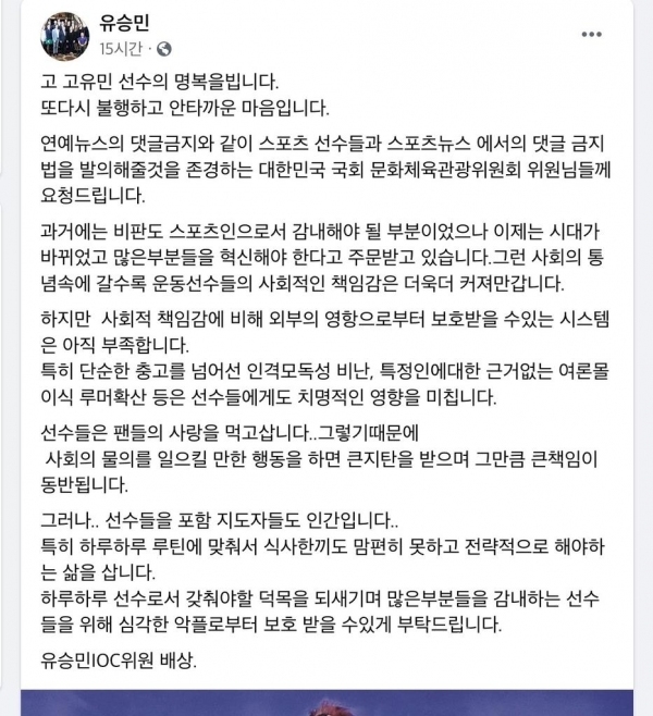 대한탁구협회장인 유승민 국제올림픽위원회(IOC) 선수위원은 SNS 계정에서 포털 스포츠 뉴스의 댓글 서비스를 금지하는 법안을 만들어 달라고 국회에 촉구했다.