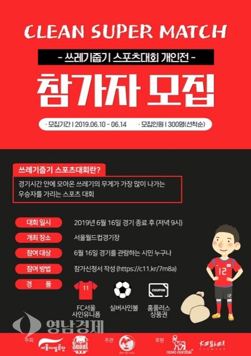 서울시설공단은 16일 마포구 월드컵경기장에서 프로축구 FC서울과 수원삼성의 경기가 끝난 후 경기 관람객을 대상으로 '제1회 클린슈퍼매치 개인전 쓰레기줍기 스포츠 대회'를 개최한다고 7일 밝혔다.