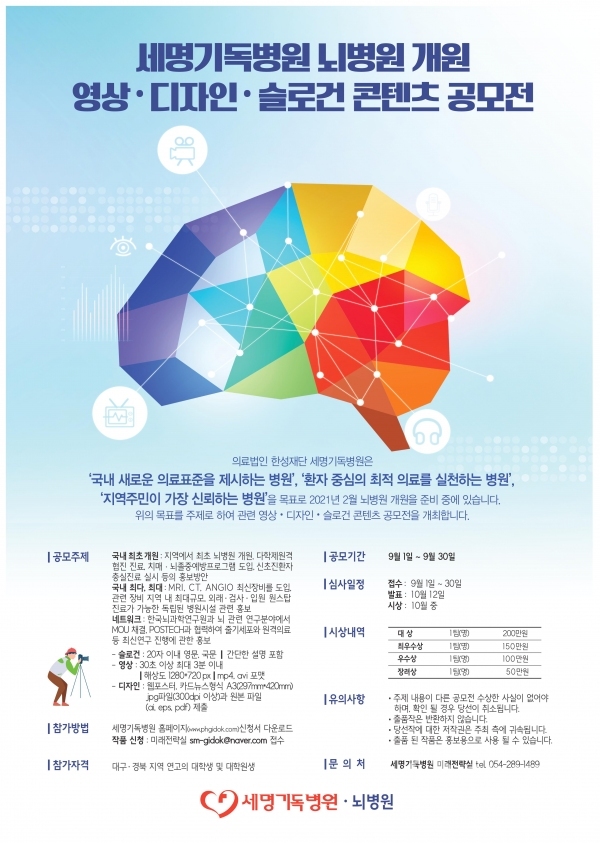 2021년 2월 뇌병원 완공 개원에 앞서 이번 공모전은 뇌병원이 지향하는 ‘국내 새로운 의료표준을 제시하는 병원’을 주제로 9월 한 달간 접수하며, 대구·경북 지역에 연고를 둔 대학생과 대학원생은 누구나 개인 또는 팀으로 응모할 수 있다.