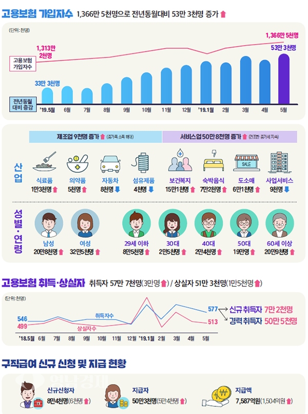 고용노동부는 10일 ‘고용행정 통계로 본 2019년 5월 노동시장 동향’을 발표하면서 구직급여 신규 신청자와 지급액 모두 증가했으나 증가폭은 지난달보다 축소했다고 밝혔다.