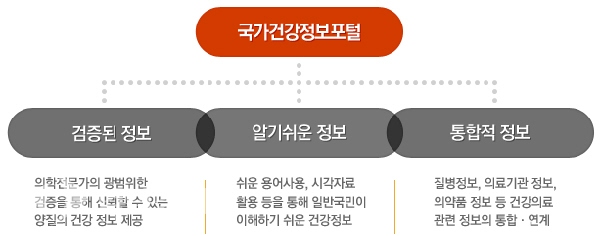 국가건강정보포털은 질병정보와 의료기관 정보, 의약품 정보 등 각 기관별로 분산된 정보를 통합·연계해 건강과 질병과 관련된 정보를 한 곳에서 얻을 수 있도록 정보제공 채널을 일원화 한 곳이다.