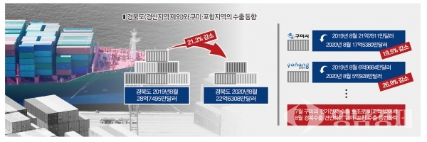 경북지역 수출은 코로나19에도 불구하고 7월까지 회복세를 보였으나 8월 들어 큰 폭으로 감소했다. 7월까지 만해도 전국적인 감소세와는 달리 견고한 회복세를 유지해 경기회복에 청신호를 보였던 경북지역 경기가 8월 들어 급격히 꺾였다.