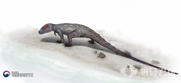 국립문화재연구소는 지난 2018년 약 1억년 전 전기 백악기 지층에서 다양한 형태의 공룡 발자국과 함께 보존 상태가 뛰어난 앞발 9개, 뒷발 9개의 발자국이 하나의 보행렬을 이룬 것을 발견했다. 이 발자국은 국내에서 보고된 공룡, 익룡, 거북, 악어, 도마뱀과 기타 포유동물 발자국 등 4족 보행 척추동물 발자국 화석들과 전혀 다른 형태였다. 좌우 발자국 사이에서는 꼬리를 끈 것으로 판단되는 흔적도 관찰됐다.