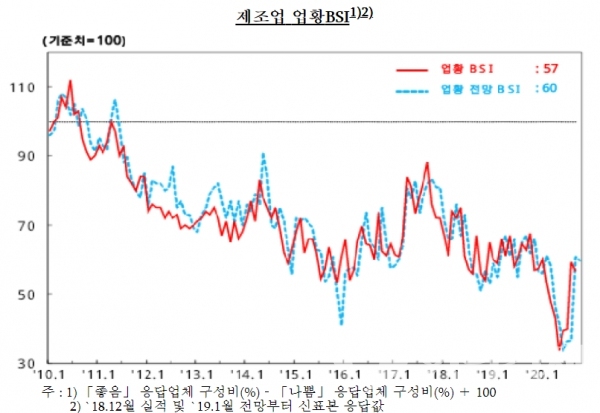 한편 BSI가 기준치인 100인 경우 긍정적인 응답업체수와 부정적인 응답업체수가 같음을 의미하며, 100이상인 경우에는 긍정응답 업체수가 부정응답 업체수보다 많음을, 100이하인 경우에는 그 반대임을 나타낸다.