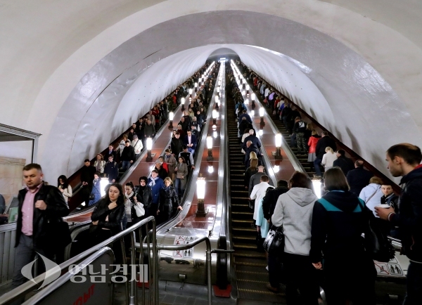 개찰구를 통과하면 상상을 뛰어넘는, 길고 긴 에스컬레이터를 만나게 된다. 끝이 보이지 않는 에스컬레이터 3대가 나란히 설치돼 있고 그사이엔 높이 80cm 정도의 원통형 조명등이 약 3m 간격으로 설치돼 불을 밝히고 있다.