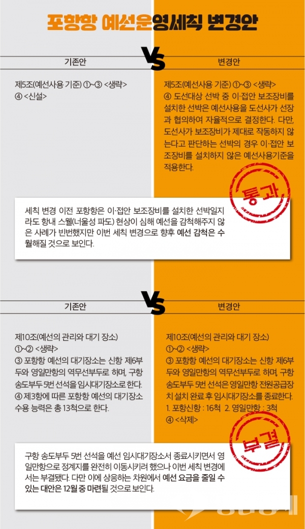 포항해수청은 세칙을 변경하면서 구항 송도부두 5번 선석에 지정된 예선 임시 정계지를 취소할 계획이었지만 이 안건은 예선사의 반발로 무산됐다.