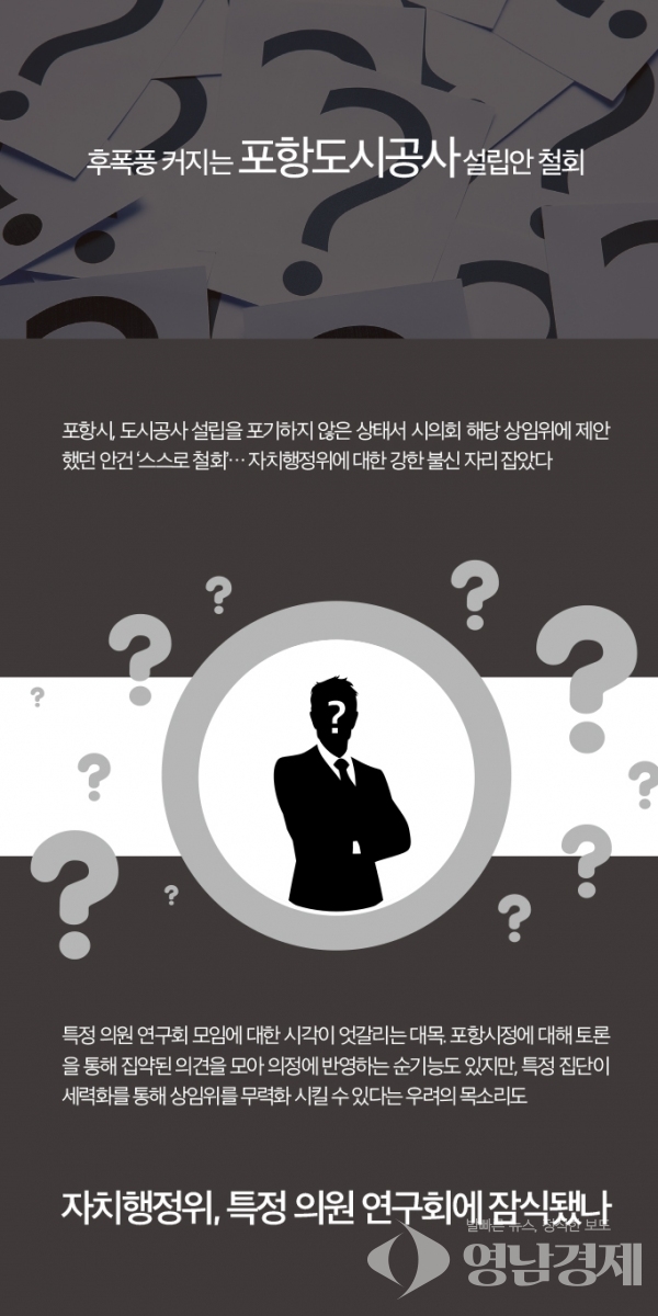 포항시가 포항시의회에 제안했다가 전격 철회한 도시공사 설립안에 대한 후폭풍이 커지는 양상이다. 이 과정에서 특정 의원 연구회 모임이 시의회 자치행정위 등 상임위를 무력화시켰다는 논란도 확산되고 있다.