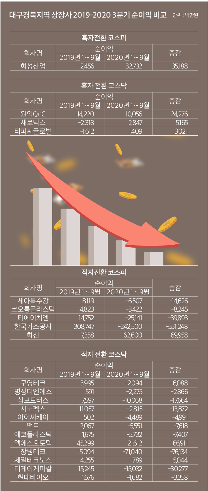 코로나19의 영향으로 국내경기는 물론 세계적인 경기침체 심화가 이어지고 있는 가운데 대구경북 지역 상장사들의 적자전환이 늘어가고 있다.