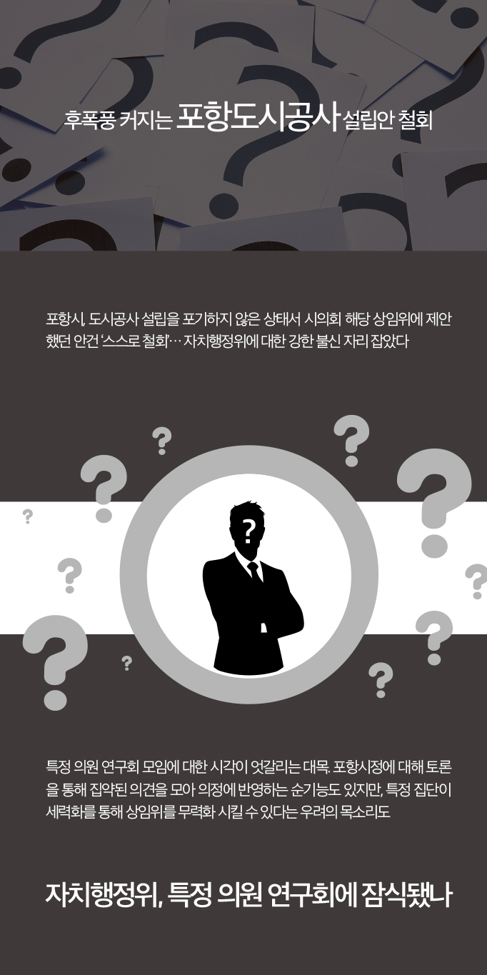 포항시가 포항시의회에 제안했다가 전격 철회한 도시공사 설립안에 대한 후폭풍이 커지는 양상이다. 이 과정에서 특정 의원 연구회 모임이 시의회 자치행정위 등 상임위를 무력화시켰다는 논란도 확산되고 있다.