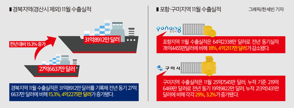 포항세관과 구미세관 수출실적은 경산시를 제외한 경북전역을 과장하고 있어 경북지역 수출실적을 사실상 대표하고 있다. 경북지역 11월 수출실적을 보면 31억8912만달러를 기록해 전년도 동기 27억6637만달러에 비해 15.3%인 4억2275만달러가 증가했다. 코로나 이전을 회복하고 초과실적을 올린 것이다.