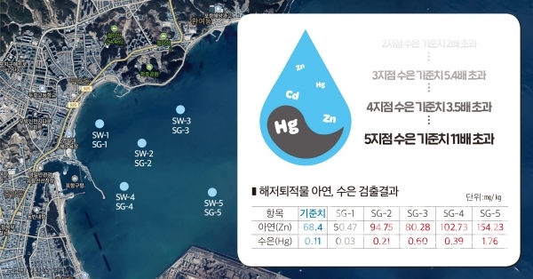 조사대상 5개 지점 중 4개 지점에서 수은, 아연 기준치 초과 검출