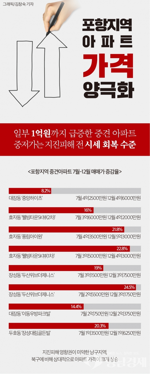 포항지역 아파트 가격 폭등 여파로 인해 중견 아파트는 급등했지만 중저가 아파트는 지진 피해 이전 가격을 회복하는데 그쳐 양극화 현상이 뚜렷해지고 있다.