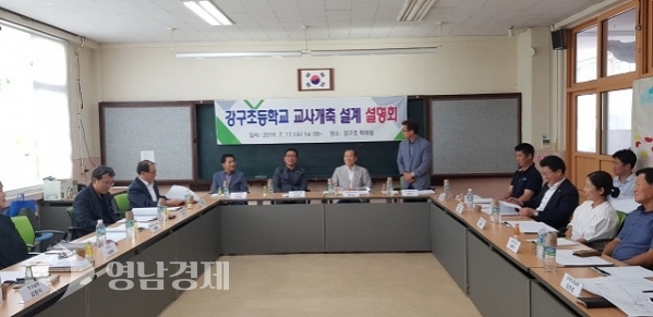 상북도 영덕교육지원청은 7월 17일 강구초등학교 회의실에서 조주홍 경북도의원, 하병두 영덕군의원, 이상용 동창회 사무국장, 학교운영위원장 및 학부모대표, 학교 관계자, 설계관계자 등 20여 명이 참석한 가운데 강구초 교사개축(지상 2층, 연면적 4,800㎡) 설계 설명회를 진행했다.