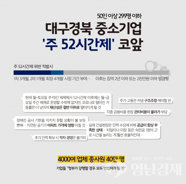 대구경북에서 52시간제를 적용받는 사업장은 4000여 업체이며, 종사원은 40만명에 달한다. 이를 이행하기 어려운 기업들은 “정부가 강행할 경우 모두 범법자가 될 판”이라며 탄식하고 있다.