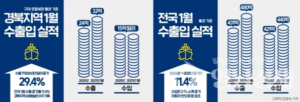 경북지역(구미·포항세관)의 올해 1월 수출은 전년도 1월 실적 24억7917만달러에 비해 29.4%인 7억2843만 달러 증가한 32억760만달러로 집계됐다. 경북지역 수출은 우리나라 전체 1월 수출증가율 11.4%에 비해 2.8배 높은 수치다.