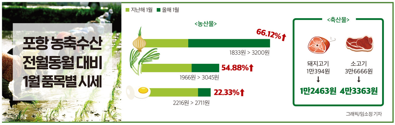 설 명절을 앞둔 포항지역의 밥상물가가 1년전에 비해 크게 오른 것으로 드러났다.