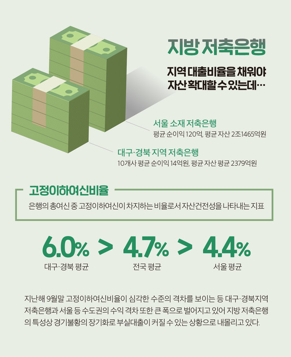 대구·경북지역 저축은행의 고정이하여신비율은 사실상 영업을 중지한 대아상호저축은행과 대원상호저축은행을 제외하고도 지난해 9월말 기준 6.0%에 달해 서울의 4.4%는 물론, 전국 평균인 4.7%와 비교해도 심각한 수준인 것으로 조사됐다.