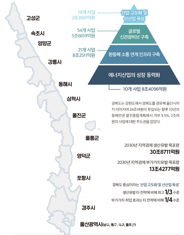 경북도가 오는 3월 9일 공청회를 예정한 동해안권 발전종합계획 변경안은 총 104개 개발사업에 국비 48.6%, 지방비 12.0%, 민자 39.4%로 구성된 총사업비 24조6729억원이 투입될 예정이다.