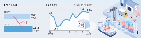 2월 수출은 지난해 같은 달보다 9.5% 늘어난 448억1천만달러로 2012년 2월(463억2천만달러) 이후 9년 만에 최고치를 기록했다.