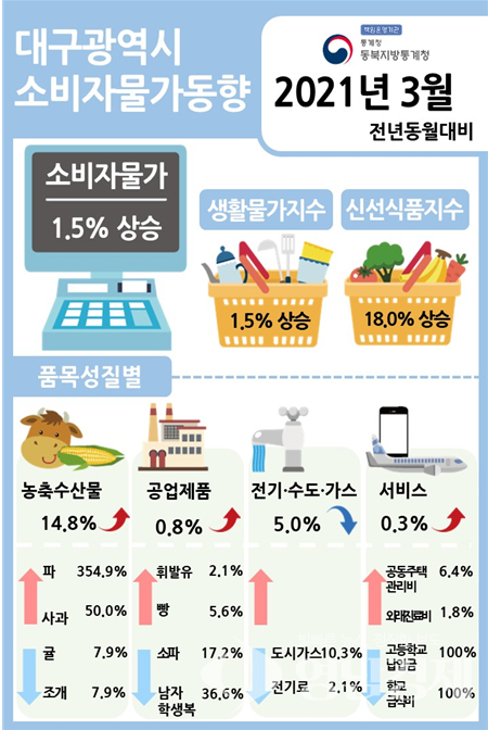 대구시의 3월 소비자물가지수는 07.68(2015년=100)로 전월대비 변동이 없었으며, 전년동월대비로는 1.5% 상승했다.