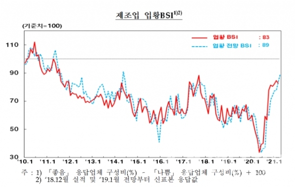 지난 2월 제조업 업황지수 급상승, 3월 비제조업황의 상승세 보여...... 3월 BSI 제조업 83, 비제조업 61....전국 평균지수는 밑돌아