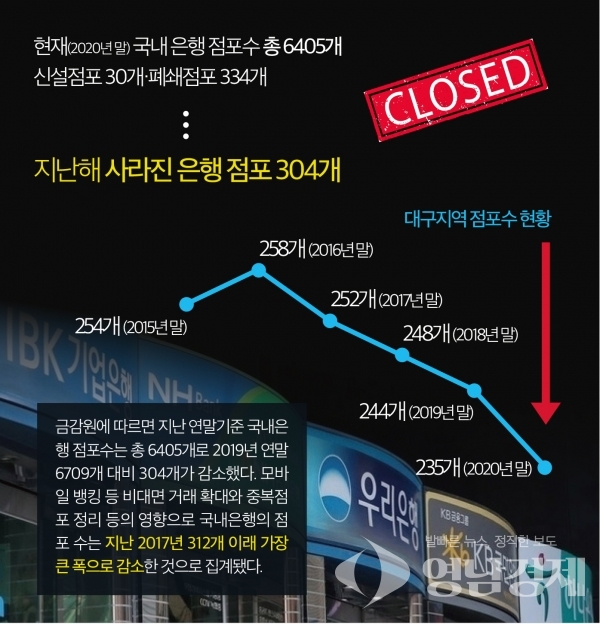 대구경북지역 유일의 지방은행인 대구은행도 2016년 258개의 점포가 2017년 252개, 2018년 248개, 2019년 244개에 이어 지난해는 235개까지 줄었는데 지난해는 2개 점포가 신설됐지만 11개 점포가 철수했다.