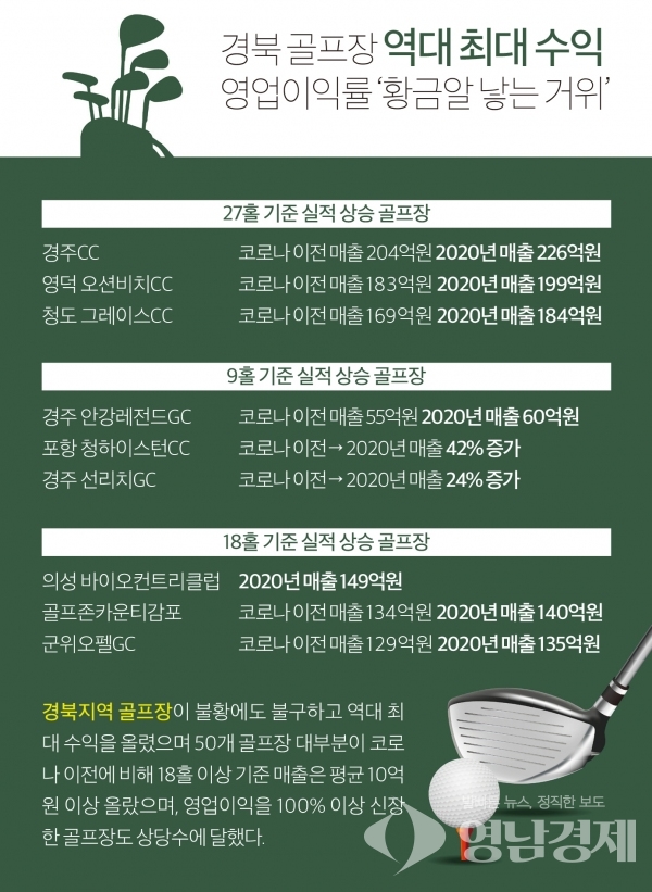경북지역에는 50개 골프장이 운영 중에 있는데 대부분 코로나 이전에 비해 18홀 이상 기준 매출은 평균 10억원 이상 올랐으며, 영업이익은 100% 이상 신장한 골프장도 상당수에 달했다.