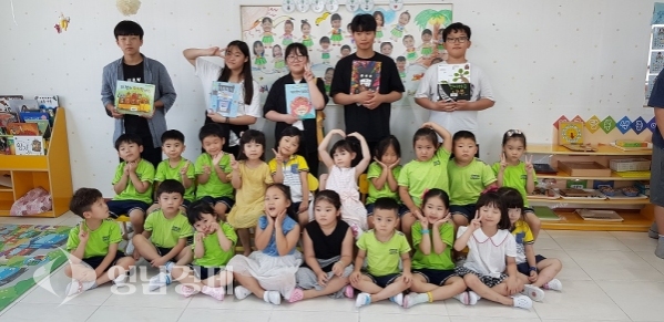 지난 22일 학생들은 어린이 집에서 원장님과 선생님의 도움을 받아 3개 반에 5명씩 배치해 어린이 4~5명씩 한 모둠을 만들어 학생들이 이동하면서 그림책을 읽어주었다. 무더운 날씨에도 불구하고 학생들과 어린이들이 모두 아름다운 추억을 나눌 수 있는 시간이었다.
