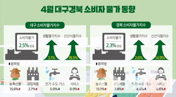 동부지방통계청의 ‘4월 대구·경북지역 소비자물가 동향’에 따르면 지난달 소비자물가지수가 직전월 대비 크게 증가하며 전년대비 대구는 2.5%, 경북은 2.3%의 상승률을 기록해 사상 최고치를 재달성한 것으로 조사됐다.