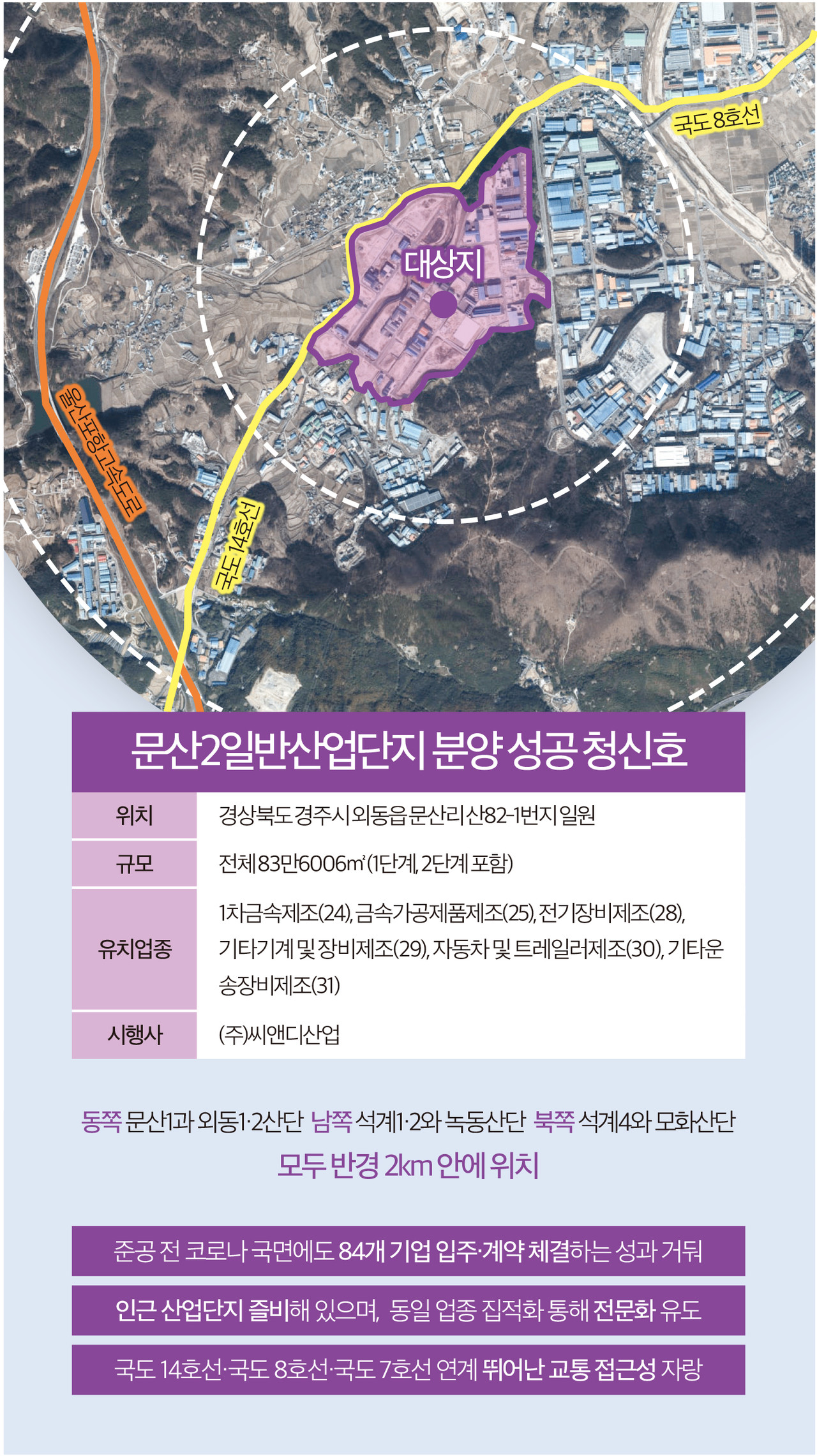 화제의 산업단지는 경주시 외동읍 석계리에 조성되는 문산2일반산업단지다. 준공을 앞두고 있는 가운데 코로나 국면에도 62개 업체가 입주한 것으로 알려져 산업단지 가운데 좋은 성과를 거뒀다는 평가를 받고 있다.