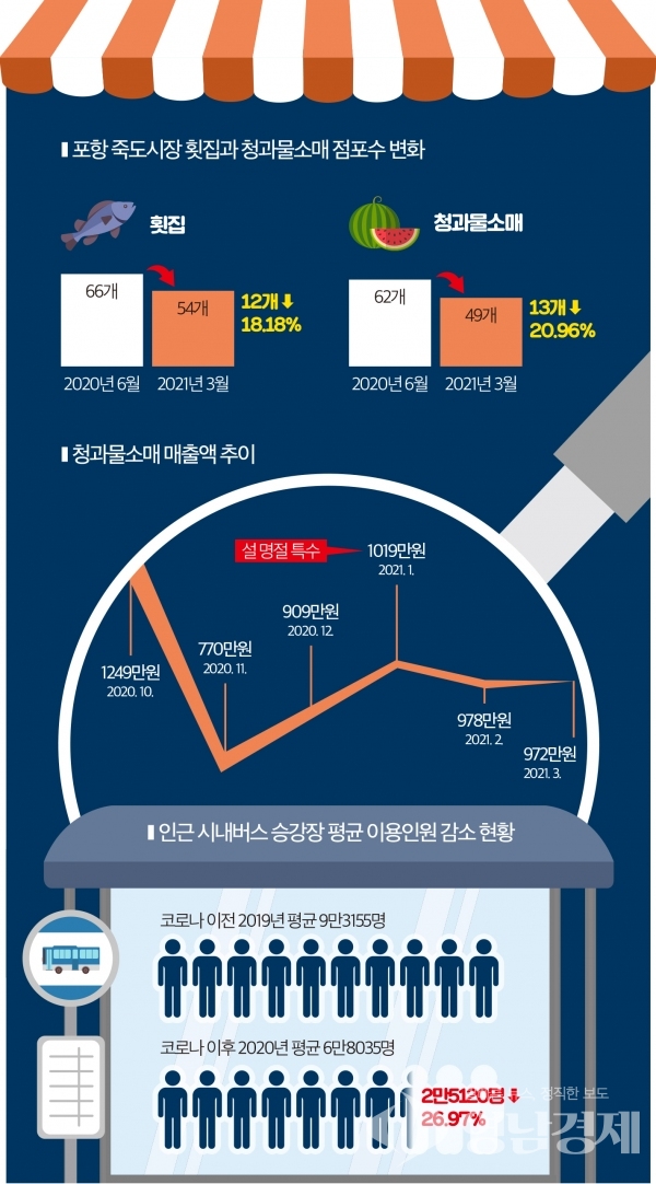 코로나19 이후 1년만에 횟집 12개, 청과물 13개 문 닫아