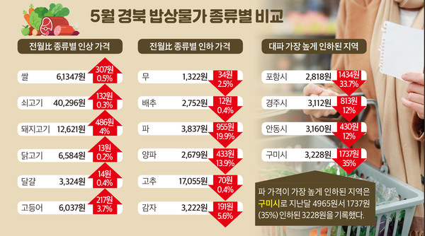 ‘파(1kg)’ 가격이 가장 높게 인하된 지역은 구미시로 지난달 4965원에서 무려 1737원(35%)이 인하된 5월 3228원을 기록했다.
