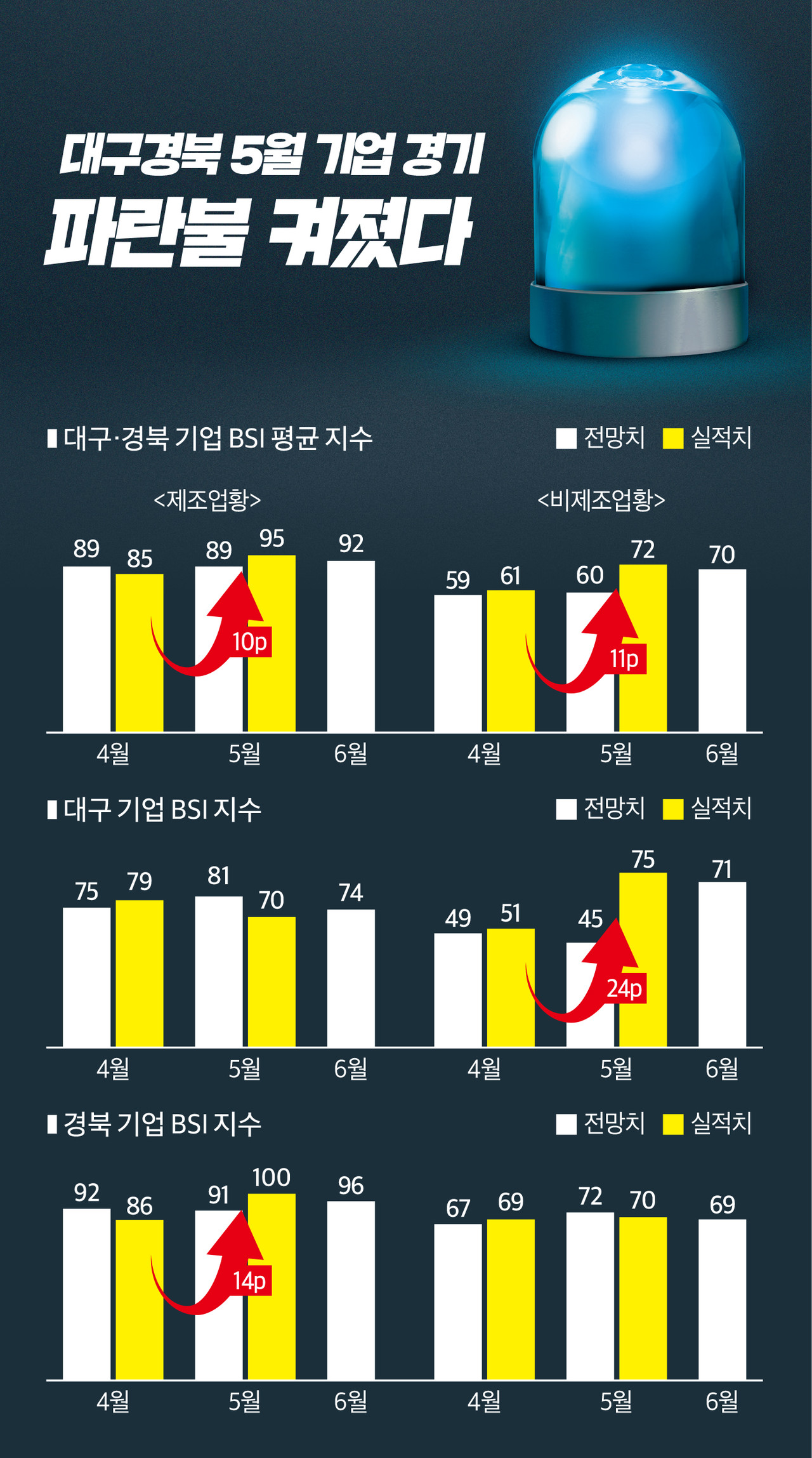 한국은행 대구·경북본부가 지난 2일 발표한 ‘5월 대구·경북 지역 기업 경기조사 결과’에 따르면 제조업 업황 BSI는 95로 전월대비 10p 상승했으며, 비제조업 업황 BSI도 72로 전월대비 11p 상승해 경기의 회복을 알렸다.