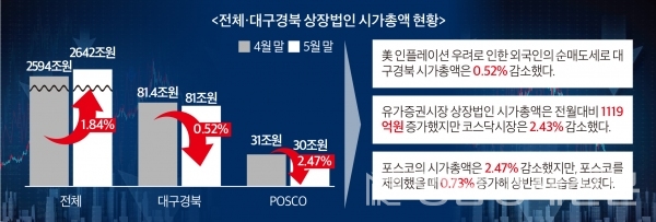 대구ㆍ경북 상장법인의 지난 5월 시가총액이 美 인플레이션 우려로 인한 외국인의 순매도세로 지난달 대비 소폭 감소한 것으로 조사됐다.