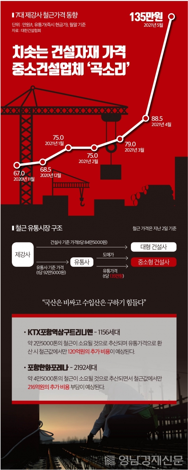 철근 유통가격은 6월 첫째 주 기준 135만원으로 치솟아 최근 신규 아파트 착공에 나선 지역 건설업계가 비명을 지르고 있다. 품귀현상과 함게 가수요까지 발생하고 있어 정부의 대책마련이 시급하다.