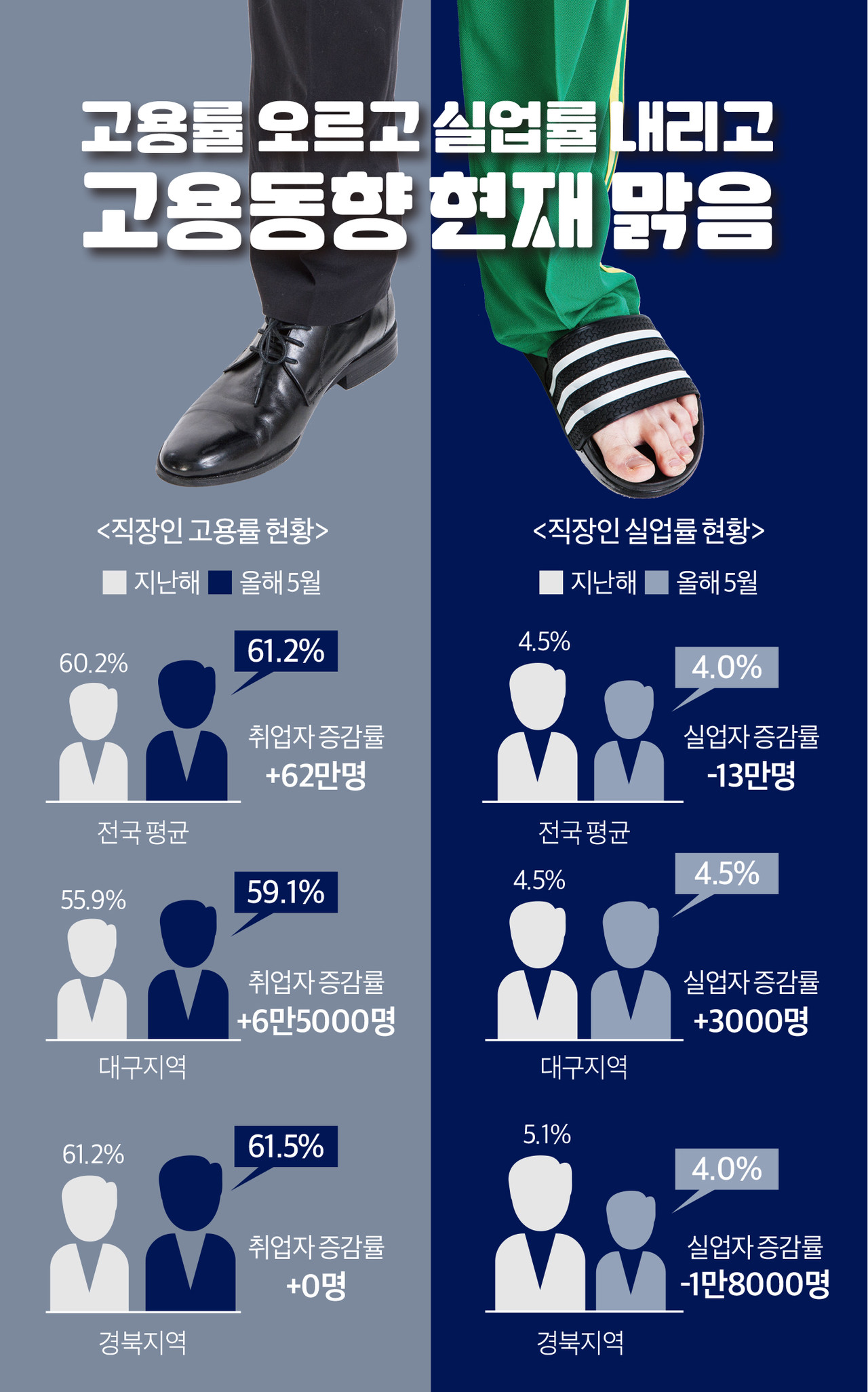 대구·경북의 5월 고용동향도 전국의 고용동향과 비슷한 양상을 나타낸 내며 고용률은 소폭 증가, 실업률은 소폭 감소 모습을 보였다.