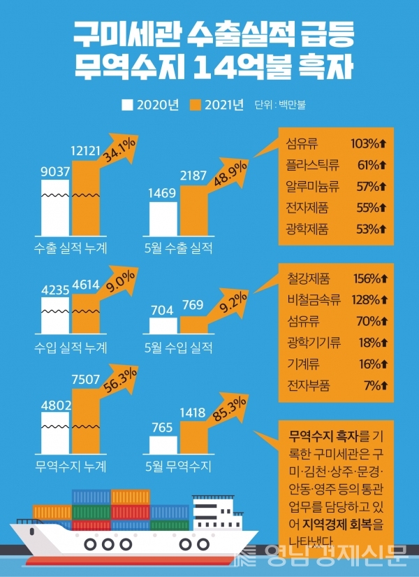 구미세관에서 지난 16일 발표한 '5월 구미세관 수출입 현황'에 따르면 지난 5월 수출은 전년동월대비 48.9% 증가한 21억8700만불, 수입은 전년동월대비 9.2% 증가한 7억6900만불을 기록한 것으로 나타났으며, 무역수지는 전년동월대비 85% 증가한 14억1800만불 흑자를 기록한 것으로 나타났다.