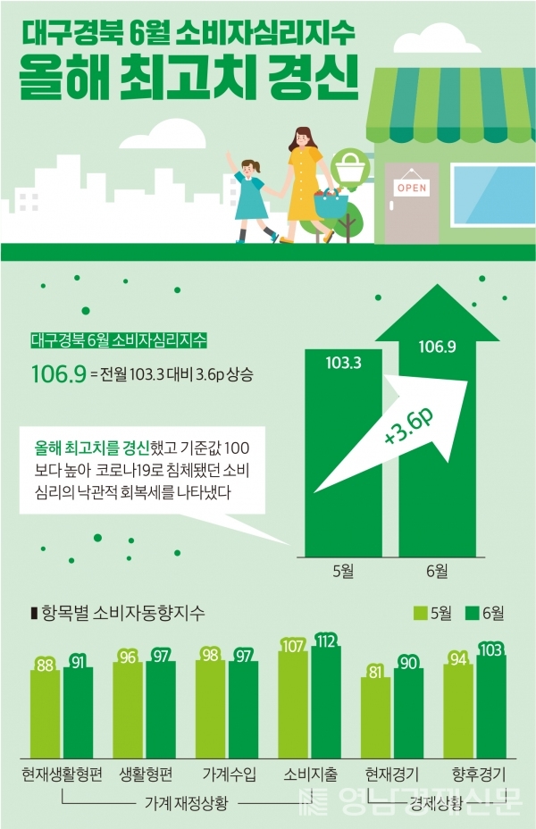 대구·경북 지역의 6월 소비자심리지수(CCSI, Composite Consumer Sentiment Index)가 올해 최고치를 경신하며 코로나19로 침체됐던 소비심리의 높은 회복세를 나타냈다.