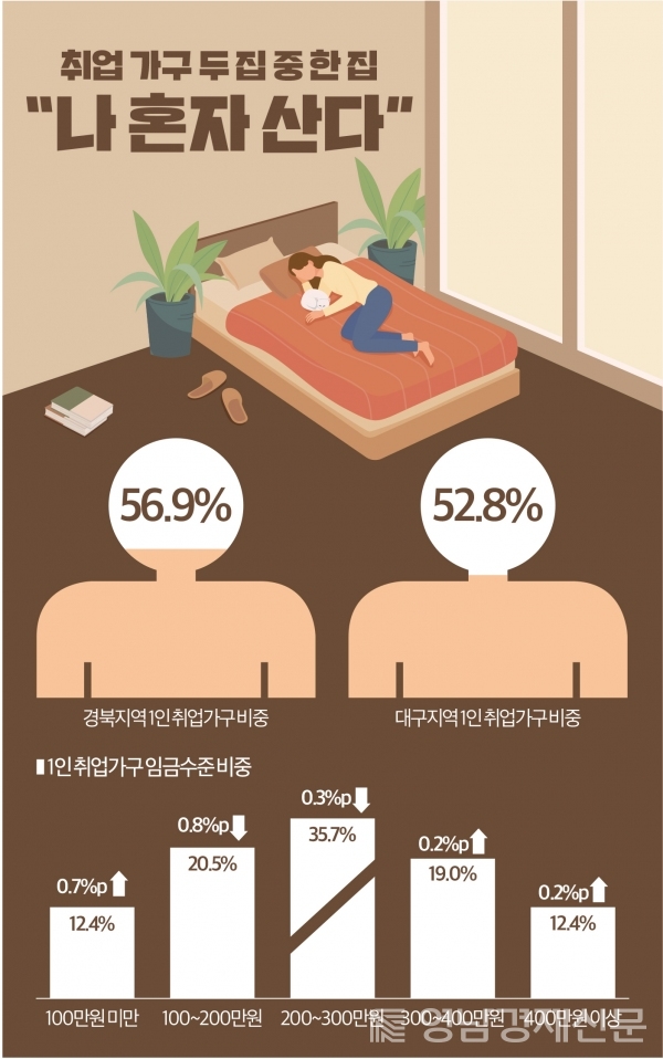 대구의 1인 취업가구는 15만가구로 전체가구의 52.8%, 경북은 21만2000가구로 전체 가구의 56.9%로 나타나 경북이 더욱 많은 1인 취업가구가 있는 것으로 조사됐다.