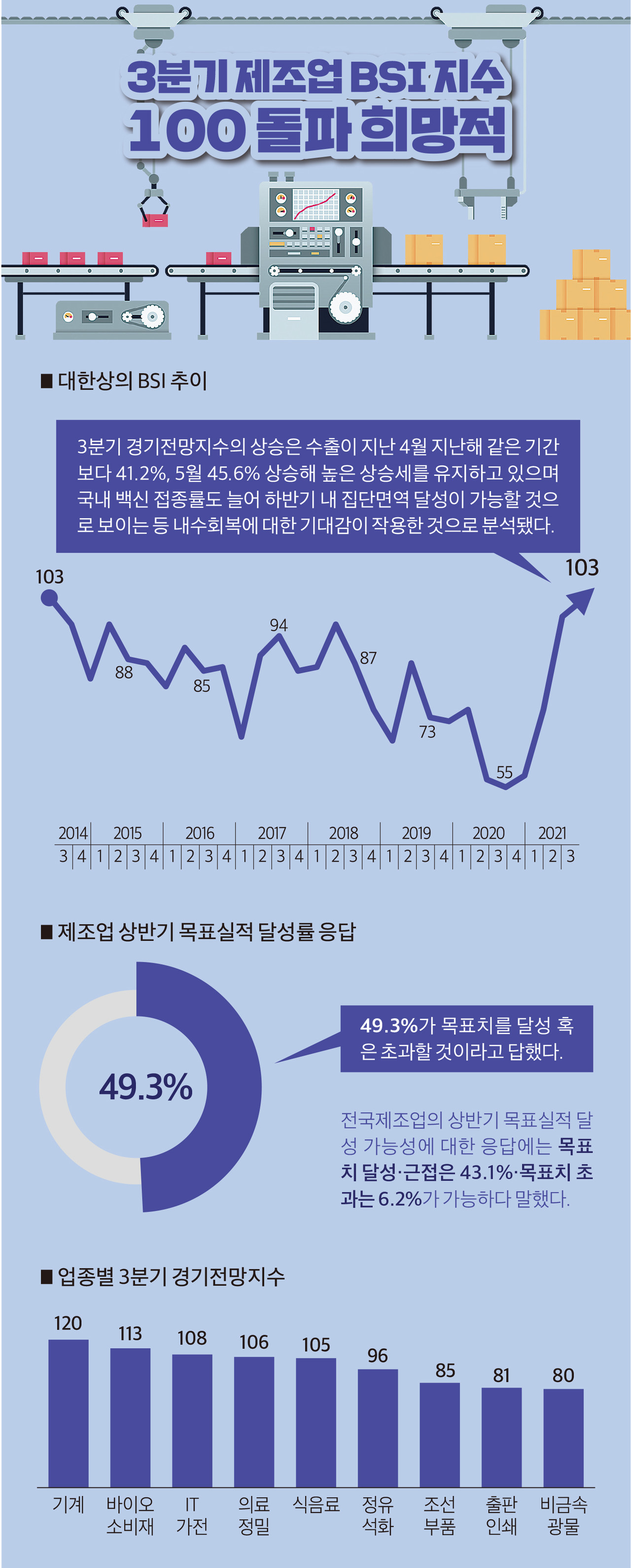 기준치 100보다 높은 경기전망 지수는 ‘3분기 경기를 2분기보다 긍정적으로 보는 기업이 더 많다’라는 의미로 지난 2014년 3분기 이래 7년 만이다.