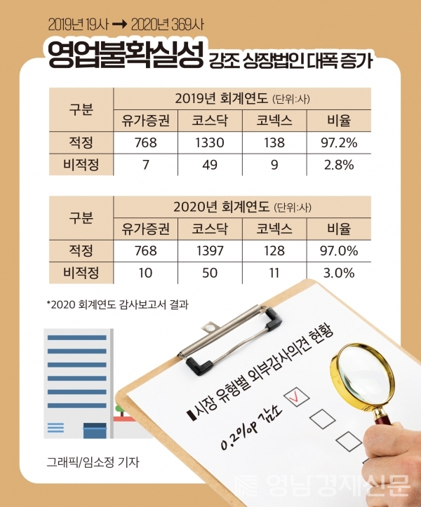상장법인 감사보고서 적정의견 비율의 감소세는 둔화됐지만 코로나19 장기화에 따라 2020 회계연도 감사보고서에 영업 불확실성이 강조된 상장법인이 대폭 늘어났다.