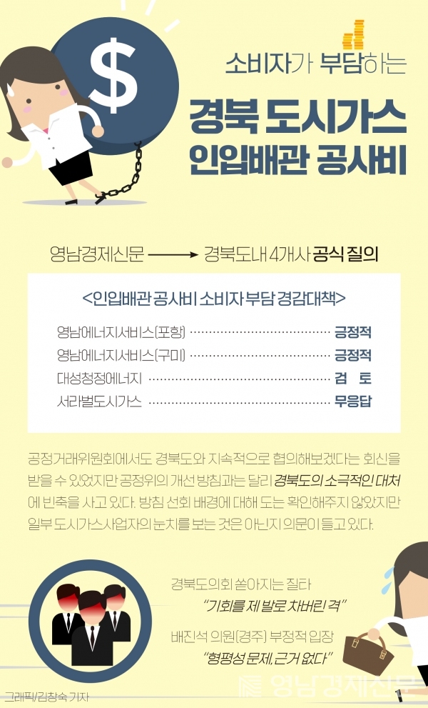 시민단체 관계자는 “공정위의 조치와 사업자들의 긍정적 반응이 있는 지금 쇠뿔도 단김에 빼야 한다”며 “이미 분위기가 인입배관 사업자 부담으로 기울고 있는 현 상황에서 경북도가 아무런 역할을 하지 못한다면 큰 문제가 된다”고 비판했다.