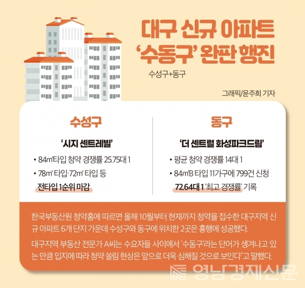 대구지역 부동산 전문가 A씨는 “최근 대구 지역의 부동산시장은 입주 물량이 쏟아지면서 미분양 물량이 급증하는 문제가 있지만, 여전히 입지와 가격에 따라 부동산 분위기가 다르다”며 “수요자들 사이에서 ‘수동구’라는 단어가 생겨나고 있는 만큼 입지에 따라 청약 쏠림 현상은 앞으로 더욱 심해질 것으로 보인다”고 말했다.