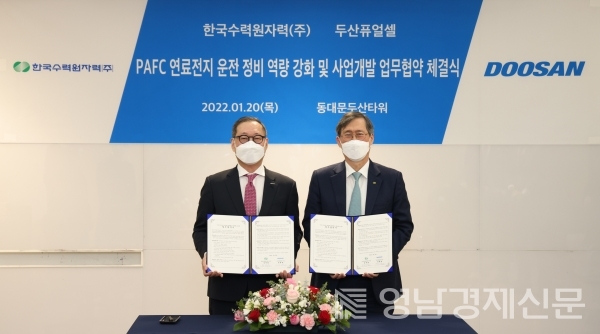 한수원과 두산퓨얼셀은 20일 서울 다산타워에서 연료전지 운전,정비 역량 강화 및 사업개발을 위한 업무협약을 체결했다.
