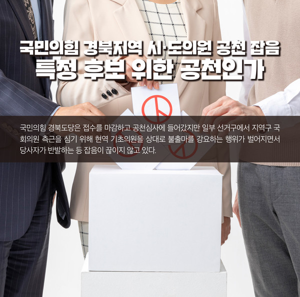 국민의힘 경북도당은 접수를 마감하고 공천심사에 들어갔지만 일부 선거구에서 지역구 국회의원 측근을 심기 위해 현역 기초의원을 상대로 불출마를 강요하는 행위가 벌어지면서 당사자가 반발하는 등 잡음이 끊이지 않고 있다.