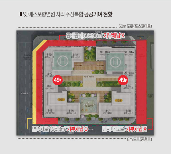 옛 에스포항병원 자리에 추진 중인 49층 초고층 주상복합이 공원, 녹지, 주차장 등의 기반시설이 제대로 갖춰지지 않아 공공기여가 결여돼 있음에도 불구하고 용적률은 1천214%를 부여하도록 설계돼 있어 도심지 난개발이 우려된다.