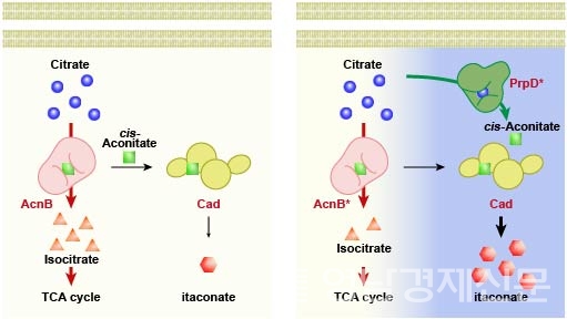 연구 결과, 해당 대장균 내에서 만들어지는 신규 효소가 아세트산에서 부터 이타콘산을 합성하는 효율성을 더욱 높이는 것으로 조사됐다.