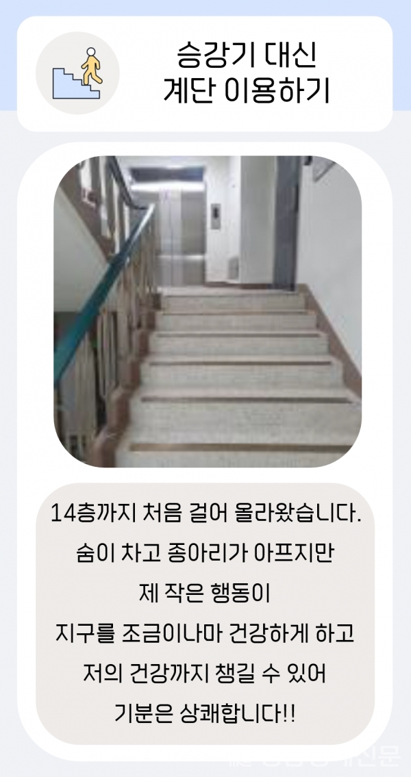 직원들은 계단 이용하기, 일회용품 줄이기, 전기 절약, 분리배출 등 10여 가지의 기후행동을 실천하며 사진과 함께 소감을 남겼다. 챌린지에 참여한 한 직원은 “실천을 인증할 때마다 점수가 쌓이니 재미있게 참여하고 있다”며 “미션이 어렵지 않아 챌린지가 끝나도 기후행동을 꾸준히 실천하려고 한다”고 소감을 밝혔다. 챌린지 시행 결과 총 30만4500점을 달성하며 울진산불로 훼손된 산림복원 묘목구입비를 기부할 수 있게 되었다.