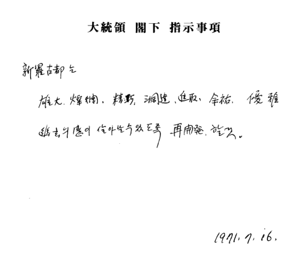 “신라고도는 웅대, 찬란, 정교, 활달, 진취, 여유, 우아, 유현의 감(感)이 살아날 수 있도록 재개발할 것”(박정희, 1971년 7월 16일)